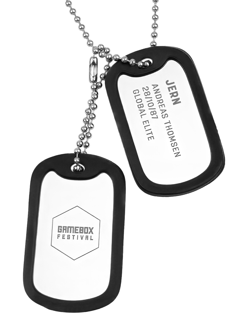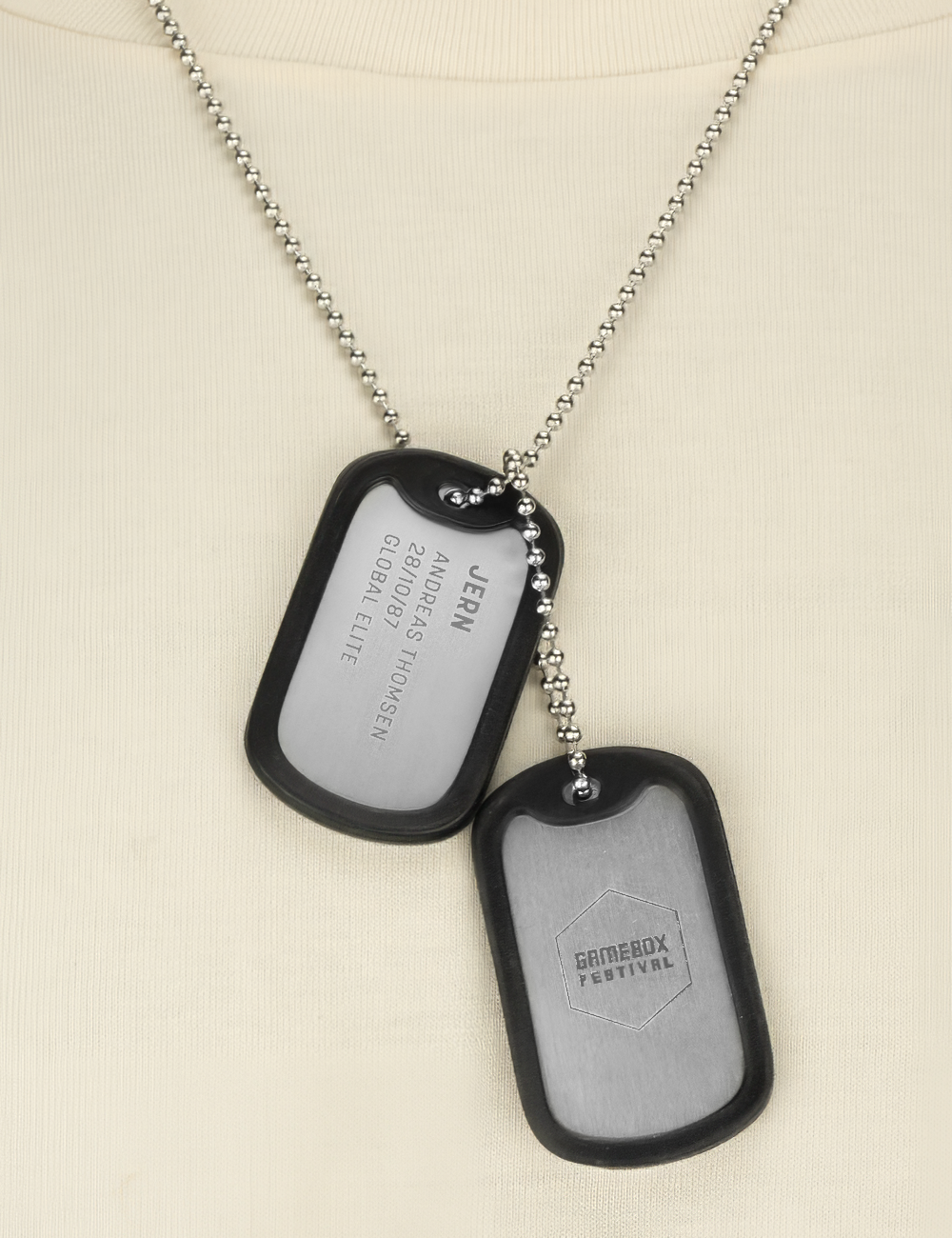 Gør dit festival-look personligt med disse eksklusive Gamebox dogtags. Inspireret af klassiske militær-tags – men med et gamer-twist.