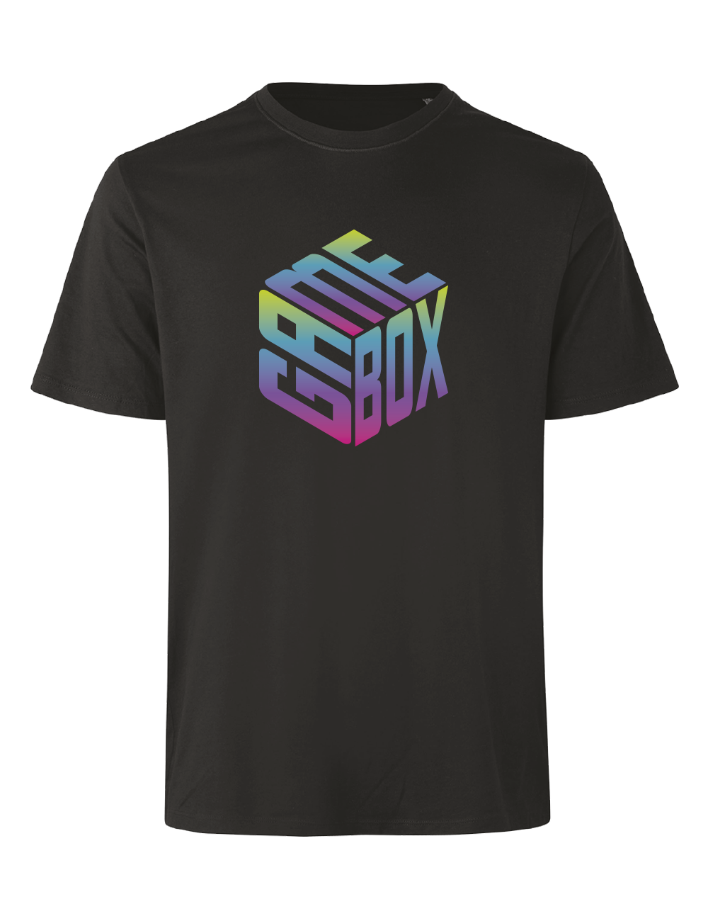 En klassisk sort t-shirt med det ikoniske Gamebox cube-logo i en farverig gradient, der giver designet et moderne og energisk udtryk.